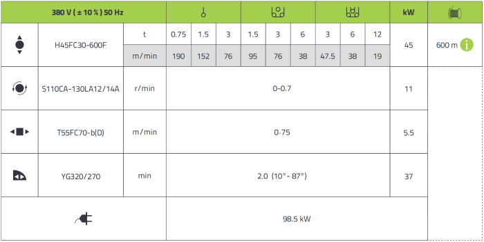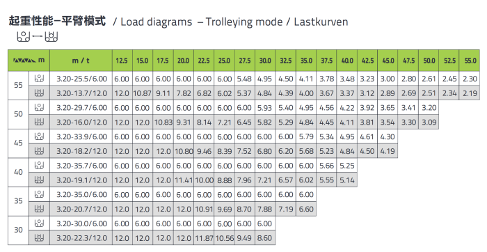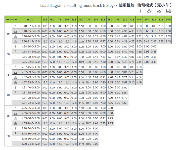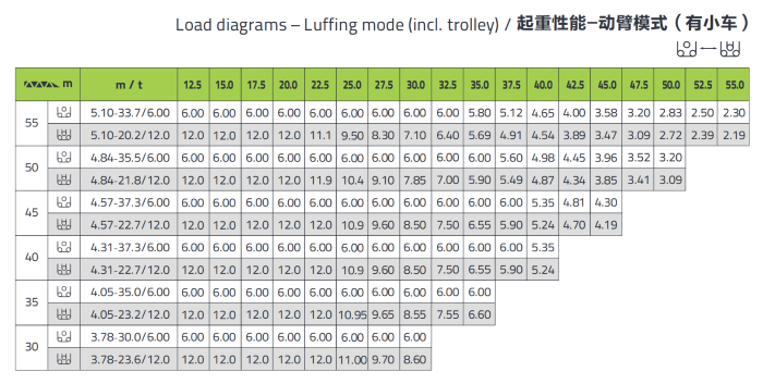 The jib can operate in the range of 10°~87°, the maximum stop angle of the jib in out of service state is 74°( 16m ), which is about 10° larger than the traditional boom. The length of the counter jib is 7.1m. Compared with the luffing crane mode, the trolleying efficiency is increased by more than 50% , and the 50m trolleying distance is shortened from 2 mins to 1 min. Compared with the luffing jib tower crane of the same tonnage level, the lifting performance is about 8% higher and the luffing speed is about 30% higher. The minimum working radius is shorter, which is more conducive to internal climbing  and anchorage installation and removal.